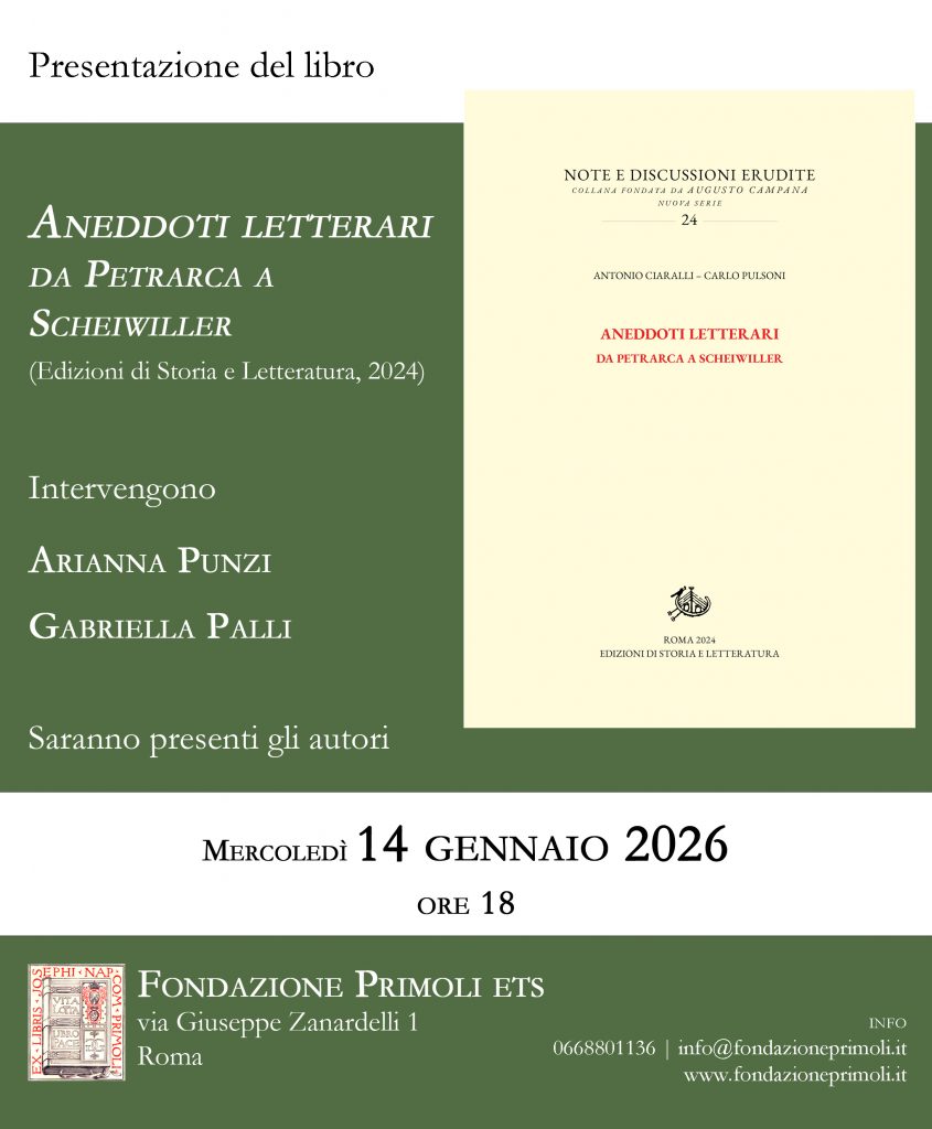 Agenda « Aneddoti letterari. Da Petrarca a Scheiwiller » di Antonio Ciaralli e Carlo Pulsoni Presentazione libro14 janvier 2026, 18:00 Pour suivre la conférence en zoom, cliquez ici