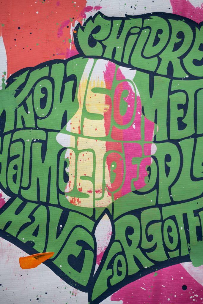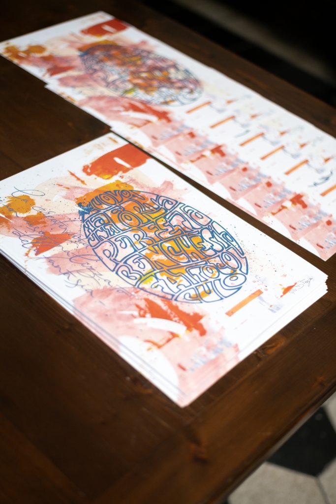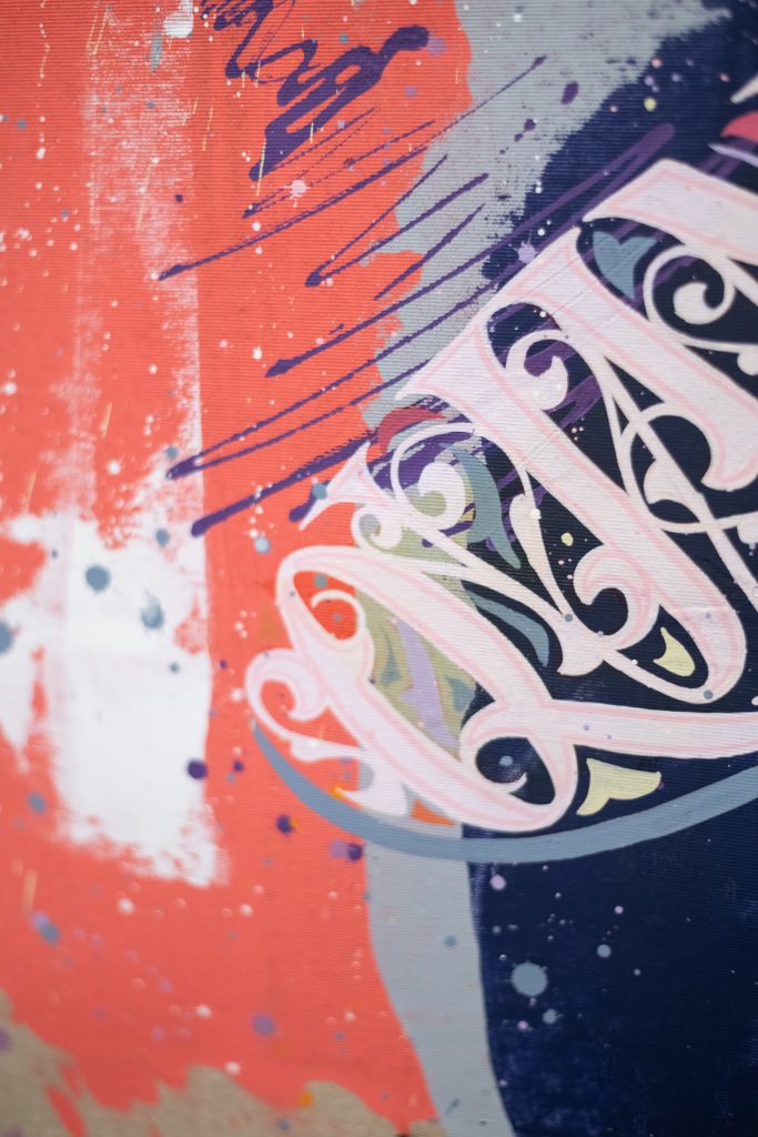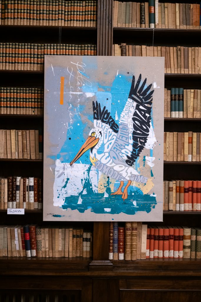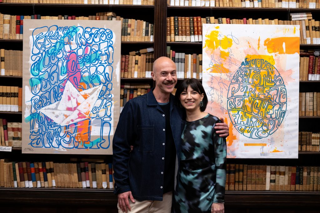 Il testo non descrive l’immagine, e l’immagine non illustra il testo ma entrambi concorrono alla costruzione del simbolo in un racconto interiore che prende forma attraverso composizioni dalla forte potenza evocativa. Concetti apparentemente semplici come arte, musica, ribellione e identità si stratificano e diventano nuclei tematici di un percorso che è, prima di tutto, autoritratto simbolico. Un sottile senso di inquietudine attraversa l’intero corpus espositivo. Le opere, spesso colorate, dinamiche e dense di rimandi, restituiscono uno stato d’animo con cui l’artista ha imparato a confrontarsi e che diventa motore creativo. La complessità compositiva riflette così una tensione interiore trasformata in linguaggio dove lettere e figure si fondono fino a diventare un unico organismo visivo. Emblema segna un momento di maturità nel percorso di Daniele Tozzi, un punto di sintesi in cui l’artista raccoglie e rilegge i propri simboli, facendo il punto sul suo universo espressivo.